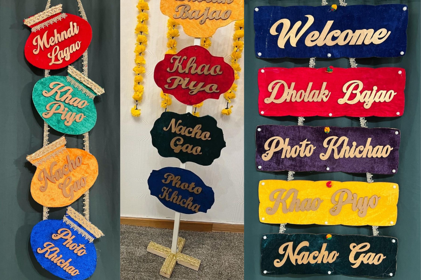 - Welcoming & Guiding: A “Welcome” sign sets the perfect tone at the entrance, while others can subtly guide guests to “Dholak Bajao” (Play the Drum!) or “Mehndi Lagao” (Apply Henna!).